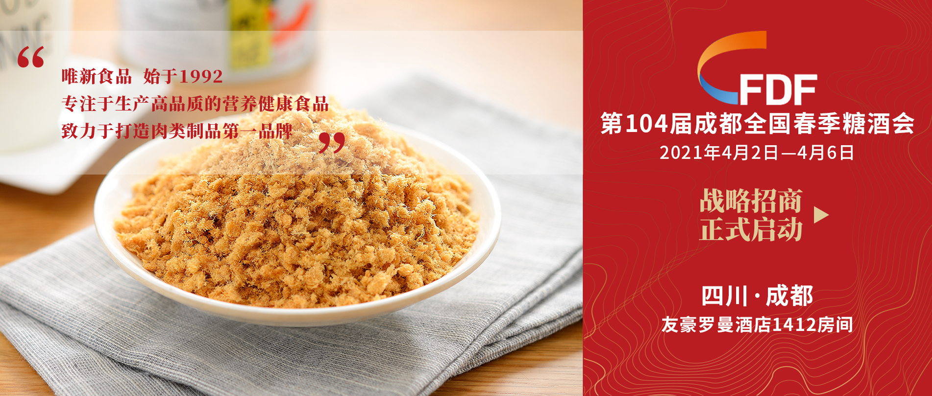 2021年4月2日,唯新食品參展第104屆全國糖酒會。展會上,唯新食品攜肉酥、休閑全系列干貨產...